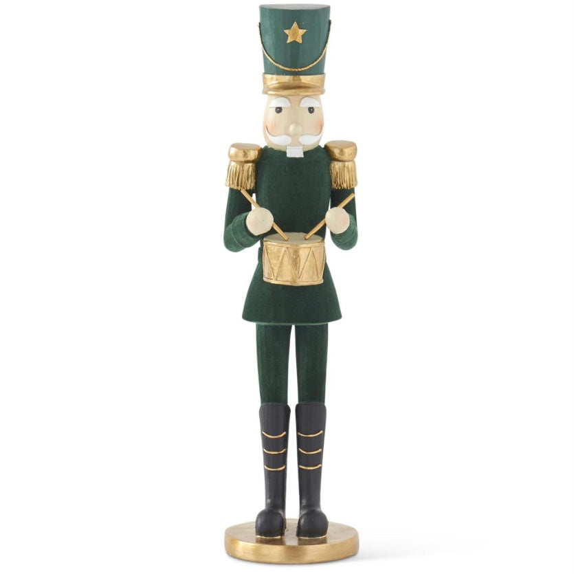 Soldados decorativos con tambor en tonos verde terciopelo y dorado, elaborados con finos detalles que evocan el encanto clásico de la Navidad.